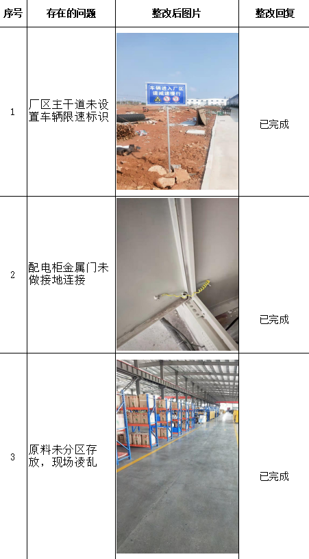 發(fā)現(xiàn)的問題及安全對策措施 | 江西沃爾肯智能裝備科技有限公司針對評價(jià)組提出的上述問題,認(rèn)真研究對策措施,制定整改計(jì)劃,切實(shí)落實(shí)整改措施,項(xiàng)目評價(jià)過程中發(fā)現(xiàn)的安全隱患已基本整改到位,整改情況如下表: